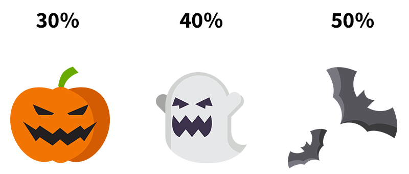 Mach dich bereit für unsere Halloween-Rabattjagd! Wir haben Kürbisse, Geister und Fledermäuse in unseren Produktbildern versteckt, und jeder bringt dir einen unheimlich guten Rabatt: