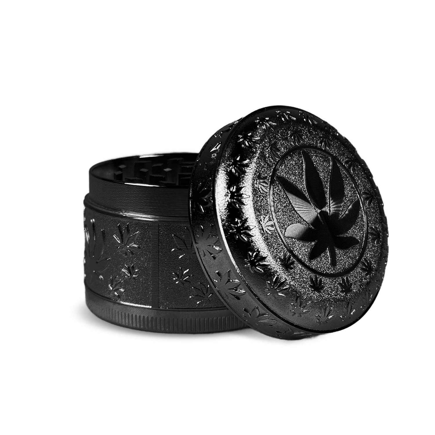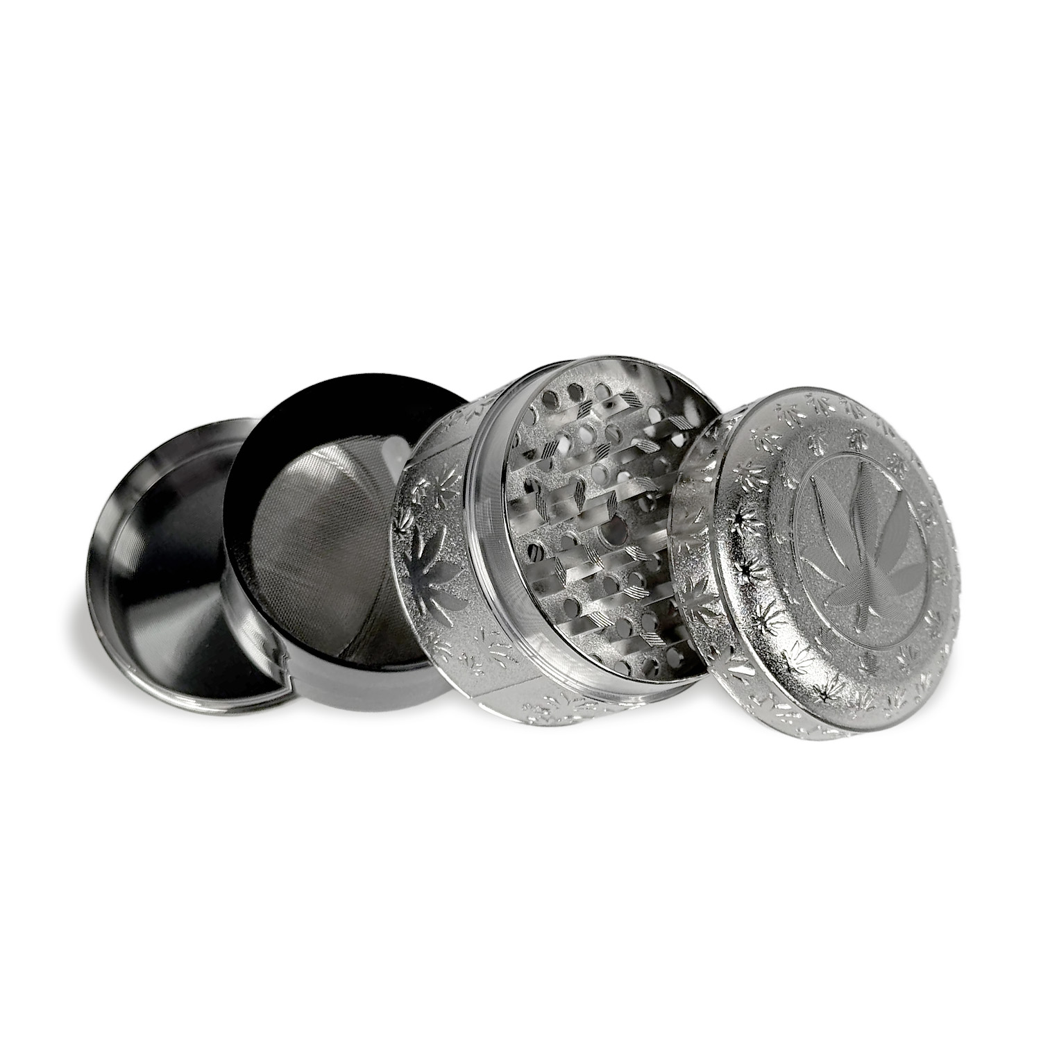 Kompakter 4-teiliger Metall-Grinder (Ø 52 mm) im Cannabis-Design mit Pollensieb, Spachtel und Magnetverschluss – perfekt für Kräuter, Gewürze und Tabak.