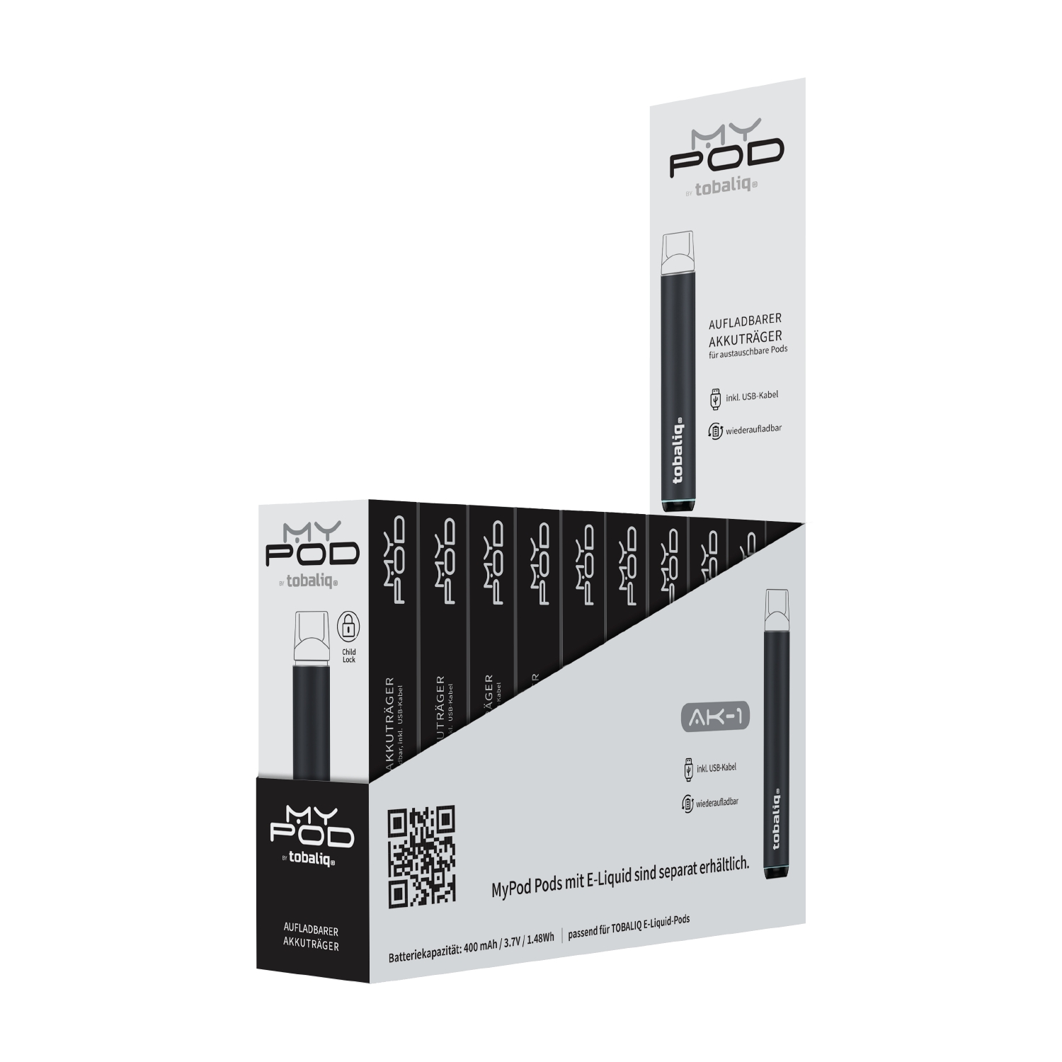 Der TOBALIQ MyPod AK-1 Akkuträger ist ausschließlich für die Verwendung mit den TOBALIQ MyPod Pods vorgesehen (nicht im Lieferumfang enthalten). Die passenden Pods können separat bestellt werden.