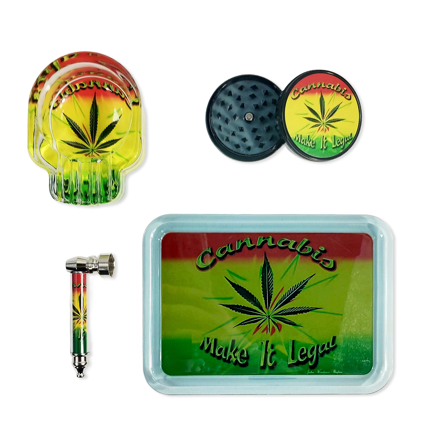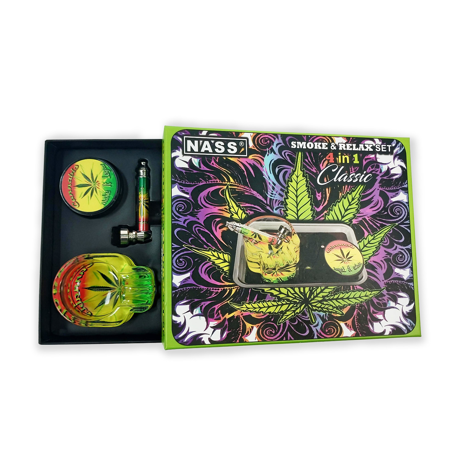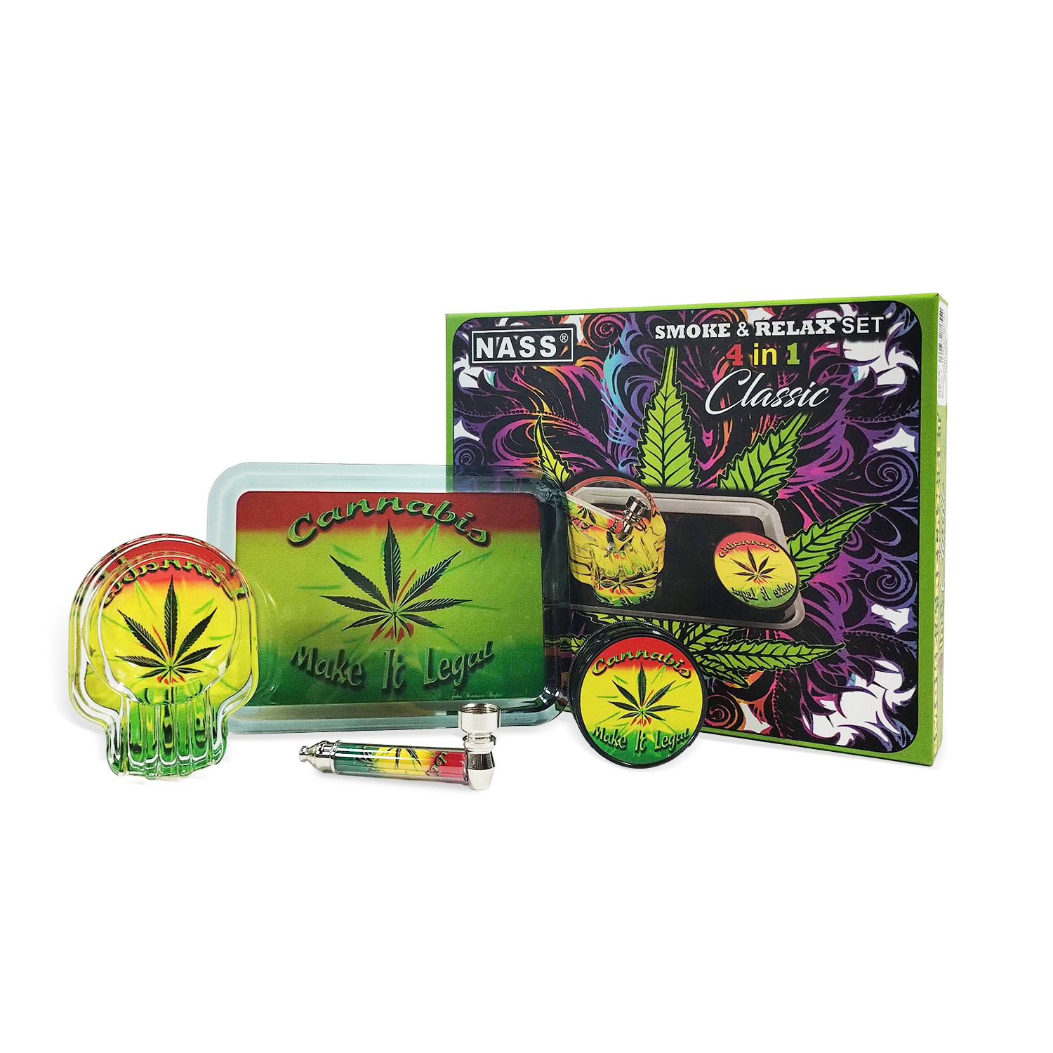 Smoke & Relax Set Classic 4-in-1 – mit Zen Tray, Plastikgrinder, Glas-Aschenbecher in Skull-Form, Metallpfeife im Rasta-Design und Geschenkbox.