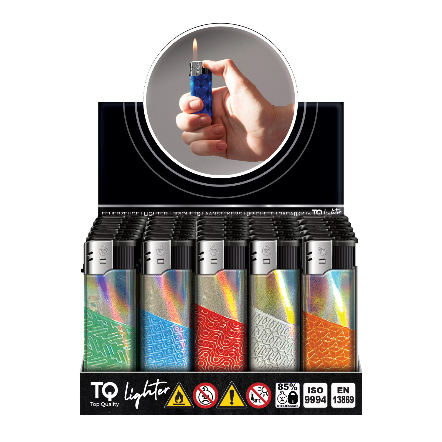 Elektronische Aluminium-Feuerzeuge mit Motiv von TOBALIQ – 50er-Display mit 5 Designs. Perfekt für Haushalt und Einzelhandel.